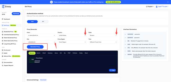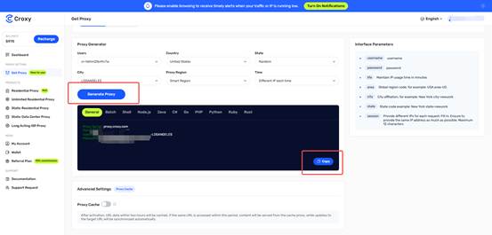 4. Visit the Croxy official website, register an account and purchase proxy, then open the user center to retrieve the proxy. Croxy residential proxies allow you to specify a city; for this tutorial, we'll select Los Angeles as our example.