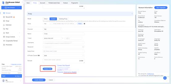 7. After completing the form, click “Connect Test.” You will see that the test location information is Los Angeles, matching the IP address extracted by Croxy.