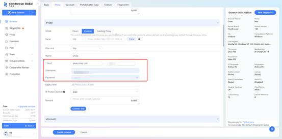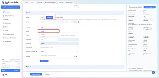 3. Scroll down to the proxy settings in your browser configuration. Select “Custom” as the proxy mode and “http” as the proxy protocol.